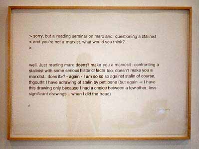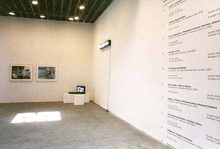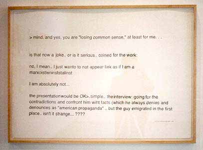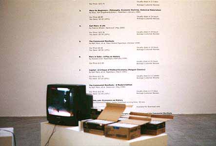 | courtesy: baumgartner gallery, new york, 2001, installation view | installation view | searching karl marx on amazon.com, 2001 wall painting, 6 meter high, dimension variable, detail | installation view with www.ganahlmarx.com | installation view | installation view | e-mail error, 2001 pencil drawing, 110 x 75 cm | installation view | installation view, with : Rudi Gurtin, My travel agent, A stalist in new york in the year 2001, 2000 2 photographs, 30 x 40 inches, video tape, 60 minutes | Rudi Gurtin | email error, 2001 pencil drawing, 110 x 75 cm | installation view | |
